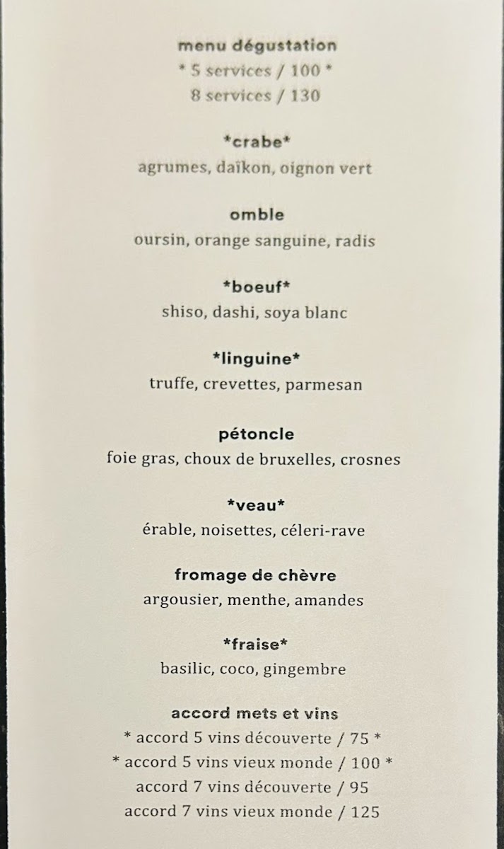 “ Bravo! This was the best upscale food of this Montreal trip (that included stops at Europea, Mon Lapin, and Joe Beef). Flavours are well balanced and excite the palate. This is clearly a kitchen that can execute well, though I feel the food was slightly better at their old location. Holding them back from getting a Michelin star is the decor, single bread choice, bland butter, no proper amuse, way-too-many-things-going-on dessert, and nothing to take home (like a loaf of fancy bread) after the meal - although perhaps that’s because ordered the dinner menu at lunchtime. ”